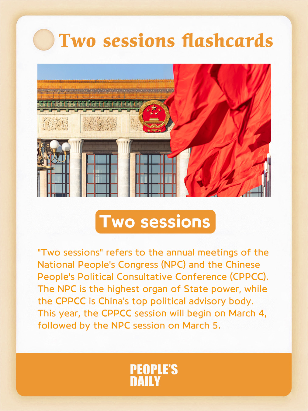 Curious about China's "two sessions?" Here's your quick flashcard-style breakdown: clear, concise and easy to understand. Get up to speed on one of the most important events in China's political calendar.