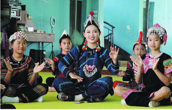 Yang (center) teaches local children the Hani Lezuo dance at the Yuni Cultural Heritage Center in Honghe Hani and Yi autonomous prefecture, Yunnan province. LI ZIYU/FOR CHINA DAILY