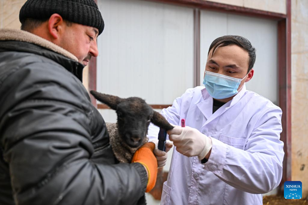 Staff members put on an ear-tag on a lamb at a sheepfold in Manas County of Changji Hui Autonomous Prefecture, northwest China's Xinjiang Uygur Autonomous Region, on March 3, 2026.