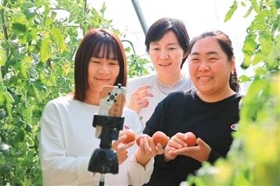 Yue Qiaoyun (center) hosts a livestream session with fellow villagers in Pinggu district, Beijing. (Photo courtesy of Yue Qiaoyun)