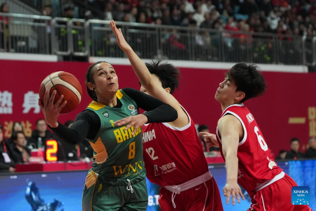 Zhang Ziyu (C) of China competes during a warm-up match between China and Brazil in Changsha, central China's Hunan Province, on March 4, 2026. (Xinhua/Chen Zhenhai)