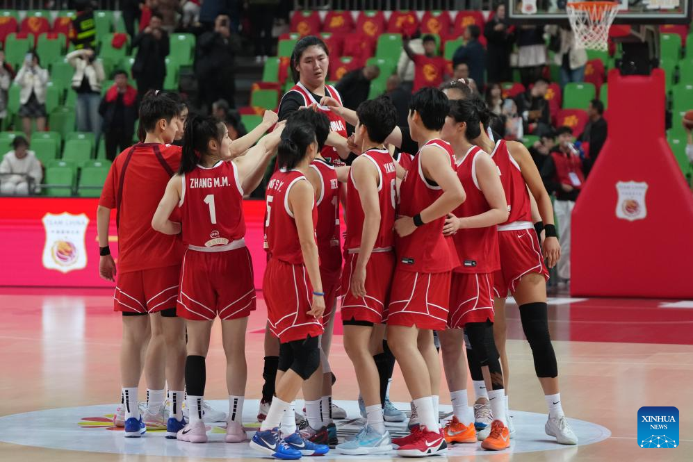 Players of China celebrate after winning a warm-up match between China and Brazil in Changsha, central China's Hunan Province, on March 4, 2026. (Xinhua/Chen Zhenhai)