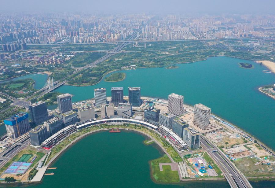 An aerial drone photo taken on July 15, 2025 shows a financial island in Zhengzhou, Central China's Henan province. [Photo/Xinhua]