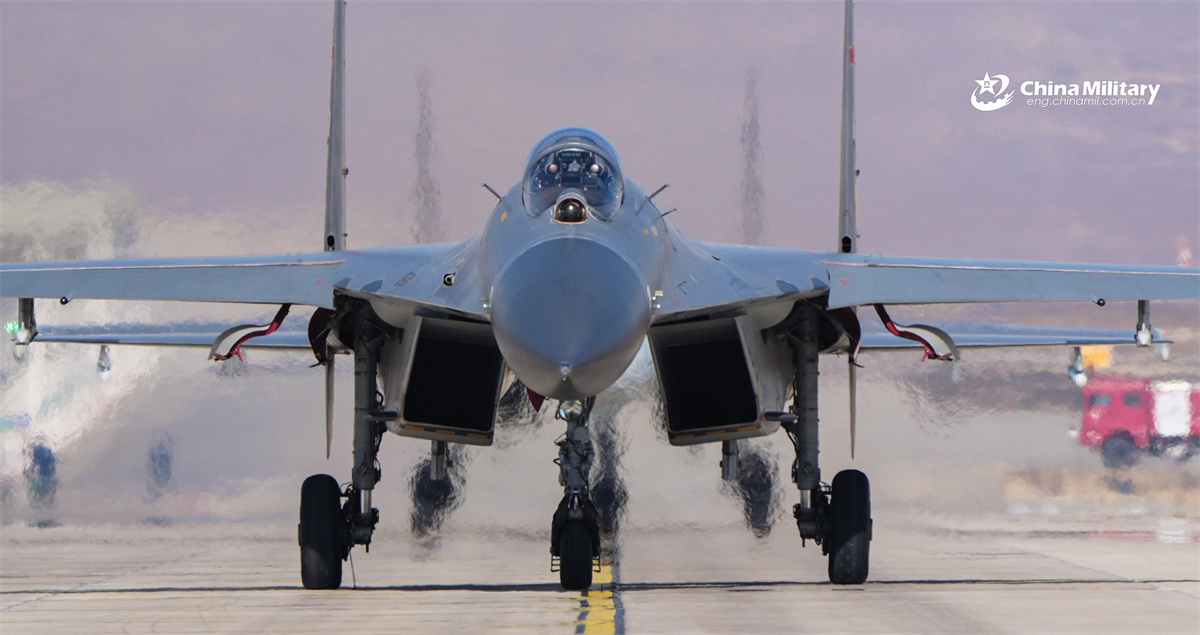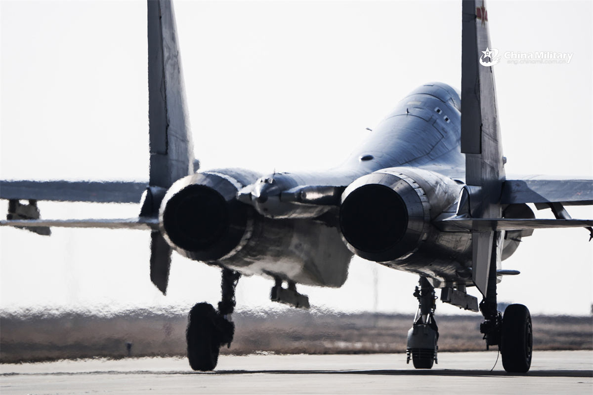 A J-11 fighter jet attached to a unit with the air force under the Chinese PLA Western Theater Command taxies on the runway before takeoff during a flight training exercise on February 26, 2026. (eng.chinamil.com.cn/Photo by Yu Zeqi)