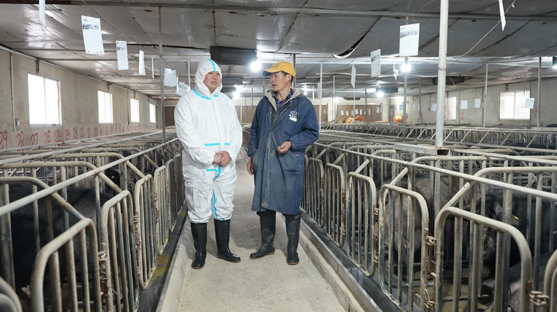 Zheng Peikun briefs a worker on spring pig farm management precautions. (Photo/Li Changzhuo)