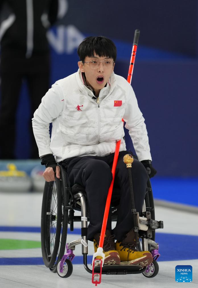 Yang Jinqiao of China reacts during the wheelchair curling mixed doubles round robin session 3 match between China and Italy at the Milan-Cortina 2026 Paralympic Winter Games in Cortina D'ampezzo, Italy, March 5, 2026. (Xinhua/Mou Yu)