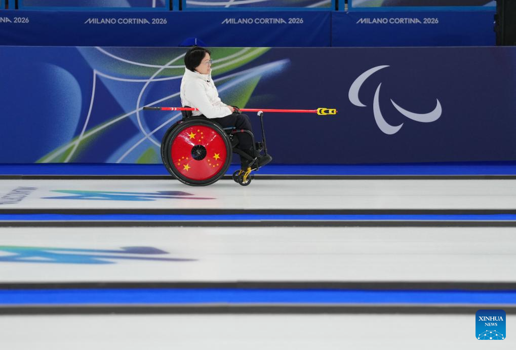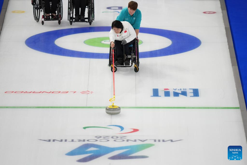 Wang Meng of China competes during the wheelchair curling mixed doubles round robin session 3 match between China and Italy at the Milan-Cortina 2026 Paralympic Winter Games in Cortina D'ampezzo, Italy, March 5, 2026. (Xinhua/Lian Yi)