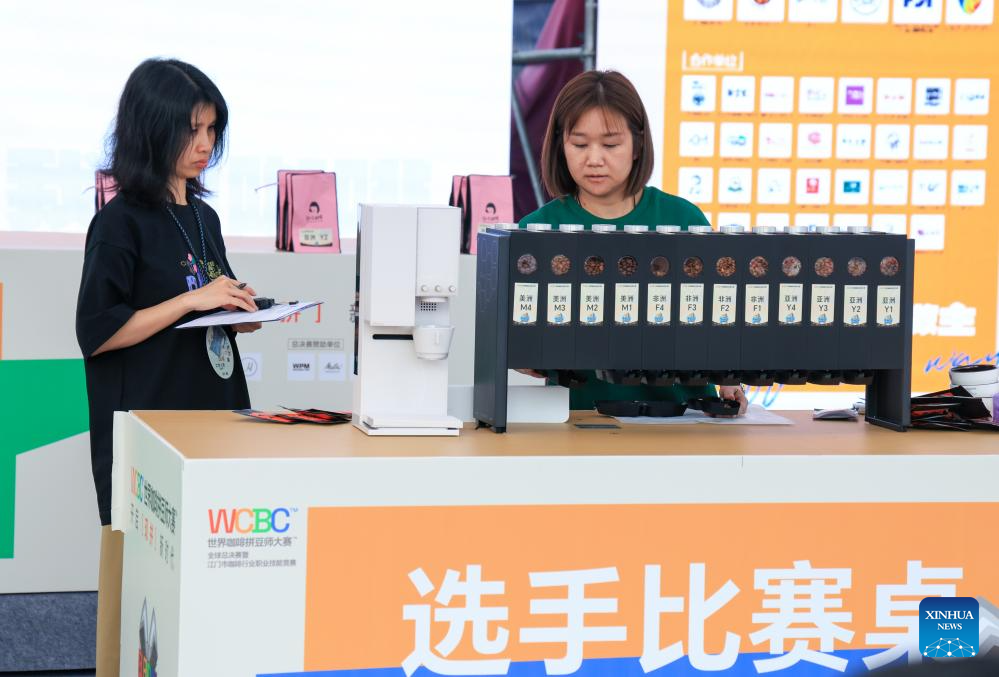 Contestants select coffee beans for blending during a competition held at the 4th Jiangmen Coffee Culture Festival in Jiangmen, south China's Guangdong Province, March 5, 2026. The festival kicked off here on Thursday, gathering more than 330 coffee brands from 13 countries and regions to showcase a full range of products including premium coffee, high-quality coffee raw materials, advanced coffee machines and elegant coffee gear. (Xinhua/Mao Siqian)