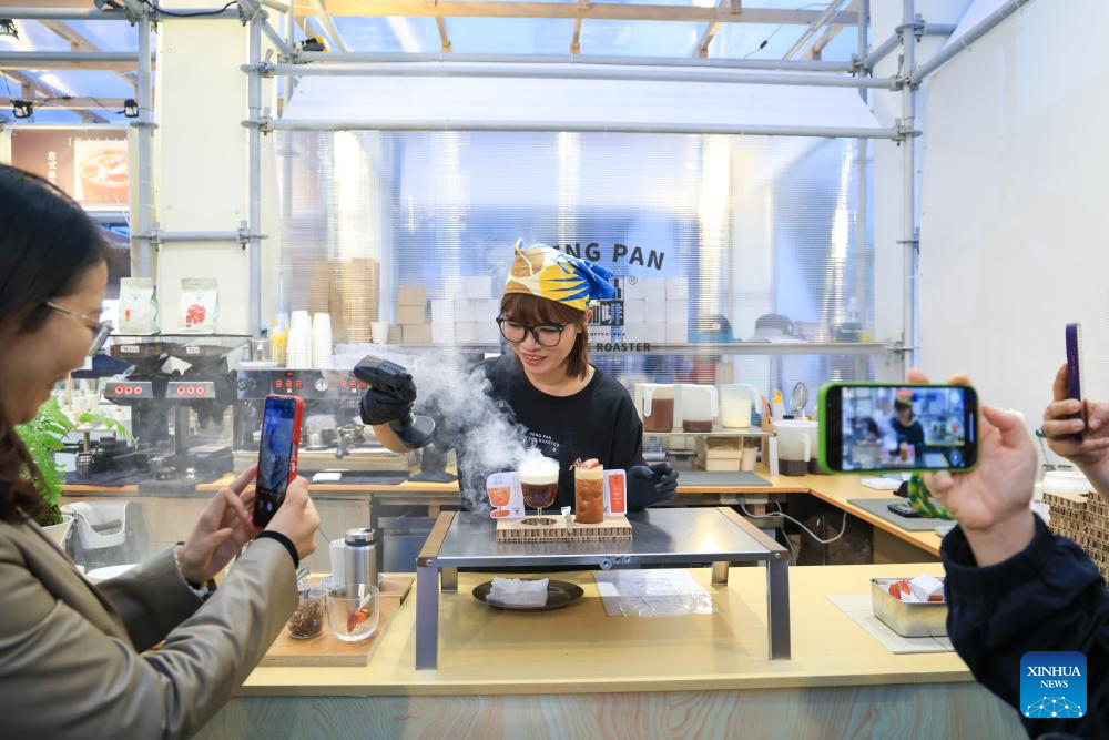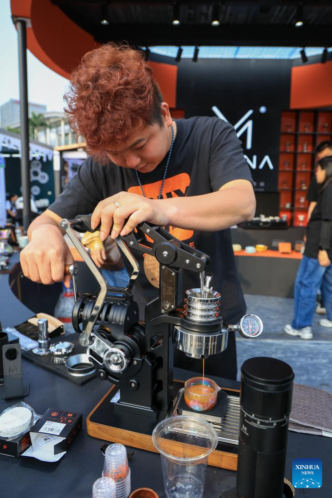 A staff member of Seng Pan Coffee makes coffee for customers during the 4th Jiangmen Coffee Culture Festival in Jiangmen, south China's Guangdong Province, March 5, 2026. The festival kicked off here on Thursday, gathering more than 330 coffee brands from 13 countries and regions to showcase a full range of products including premium coffee, high-quality coffee raw materials, advanced coffee machines and elegant coffee gear. (Xinhua/Mao Siqian)