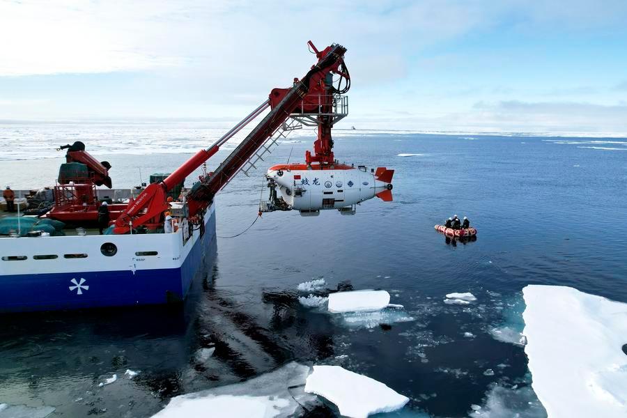 China's manned deep-sea submersible Jiaolong is about to execute a dive in the ice-covered areas of the Arctic Ocean on Aug. 11, 2025. (Xinhua/Liu Shiping)
