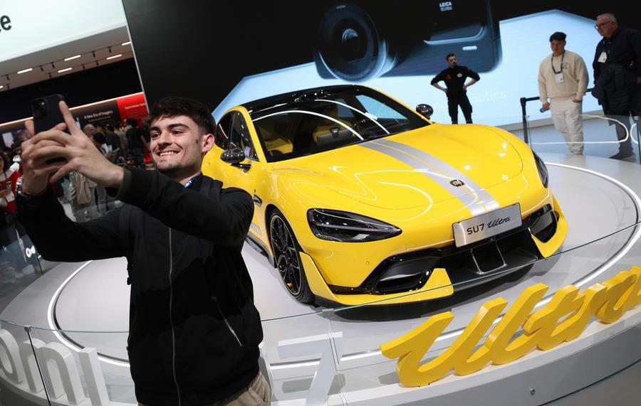 A man takes a selfie with a Xiaomi SU7 Ultra at the 2025 Mobile World Congress in Barcelona, Spain, March 6, 2025. (Xinhua/Zhao Dingzhe)
