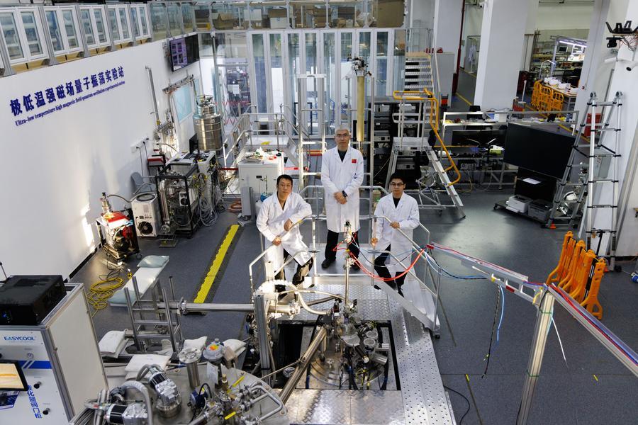 Researchers Li Gang, Liu Jianhua and Zhou Benzhe (L-R) pose for a group photo at the ultra-low temperature high magnetic field quantum oscillation experimental station of the Institute of Physics of the Chinese Academy of Sciences in Beijing, capital of China, on Jan. 26, 2026. China has achieved a 35.6 tesla all-superconducting magnet in an experiment facility, setting a new record, the Chinese Academy of Sciences (CAS) said on Jan. 27, 2026. (Xinhua/Jin Liwang)