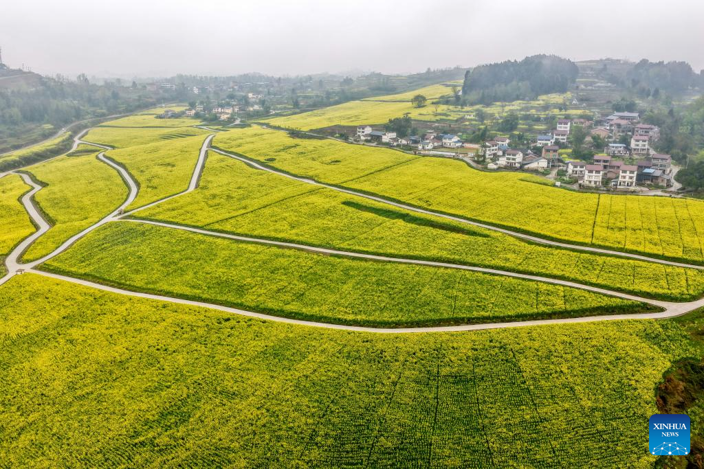 An aerial drone photo shows a rapeseed flower field in Xiucai Village, Shizhu Tujia Autonomous County, southwest China's Chongqing, March 7, 2026. (Xinhua/Tang Yi)