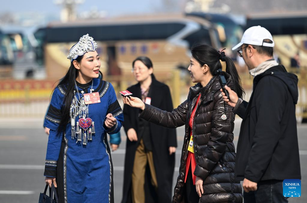 Journalists interview a member of the 14th National Committee of the Chinese People's Political Consultative Conference (CPPCC) ahead of the third plenary meeting of the fourth session of the 14th CPPCC National Committee in Beijing, capital of China, March 8, 2026. (Xinhua/Li He)