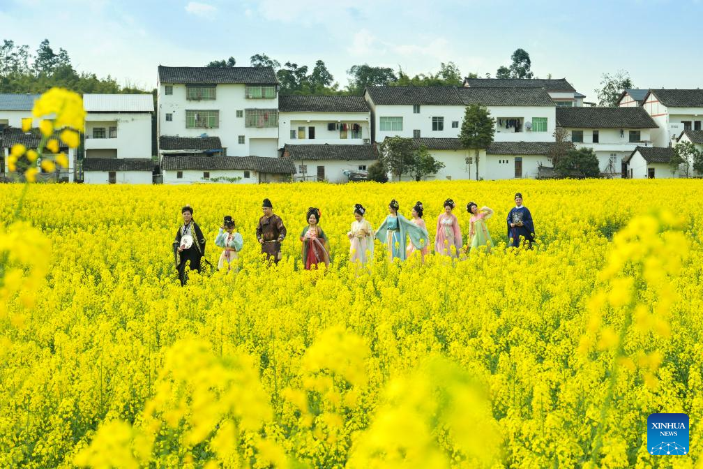 Tourists wearing traditional costumes walk among flowering canola fields in Guang'an City, southwest China's Sichuan Province, March 5, 2026. (Photo by Zhang Guosheng/Xinhua)