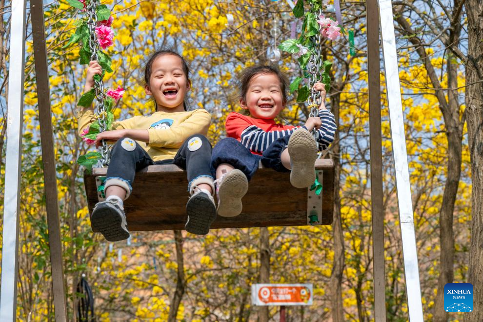 Children play on a swing under blooming flowers in Wuzhou, south China's Guangxi Zhuang Autonomous Region, March 7, 2026. (Photo by He Huawen/Xinhua)