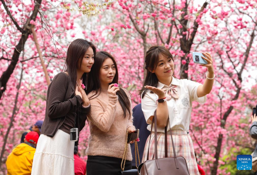 Tourists view flowers in Eryuan County, southwest China's Yunnan Province, March 7, 2026. (Photo by Luo Xincai/Xinhua)