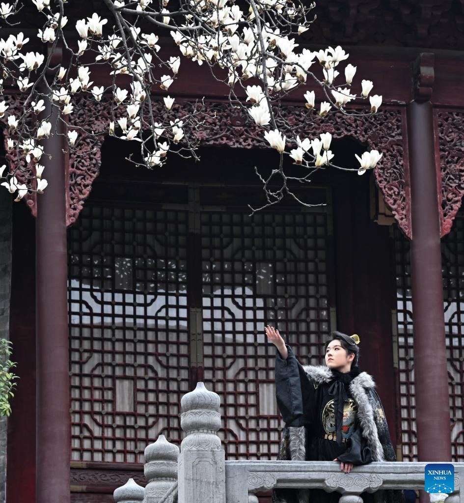 Tourists wearing traditional costumes take photos with magnolia flowers in Nanjing, east China's Jiangsu Province, March 7, 2026. (Photo by Sun Zhongnan/Xinhua)