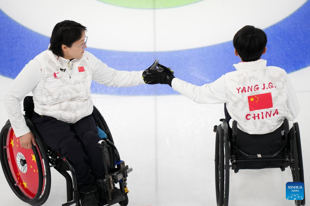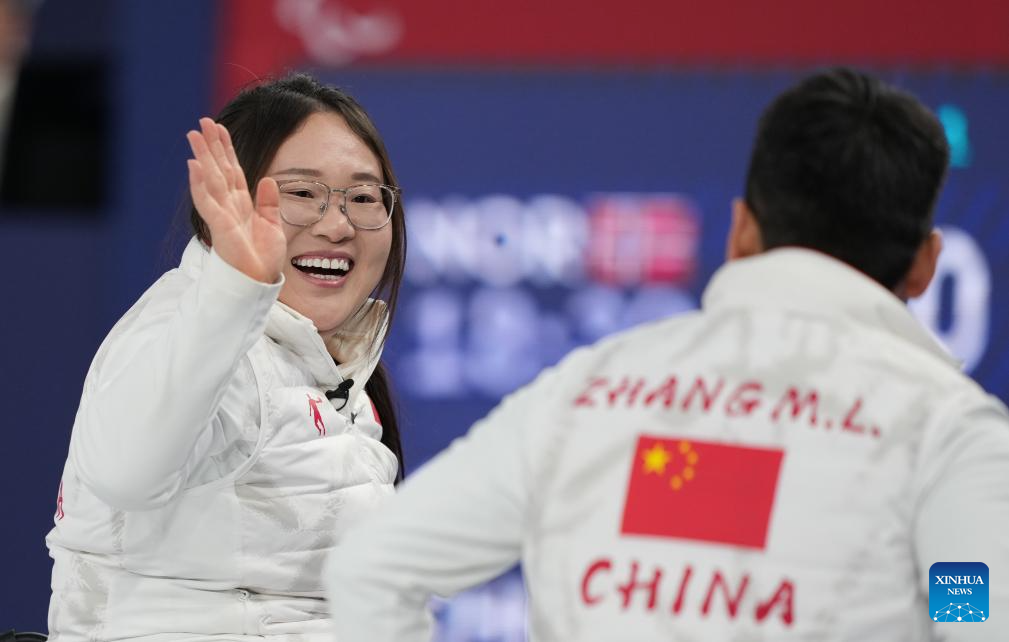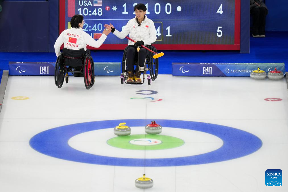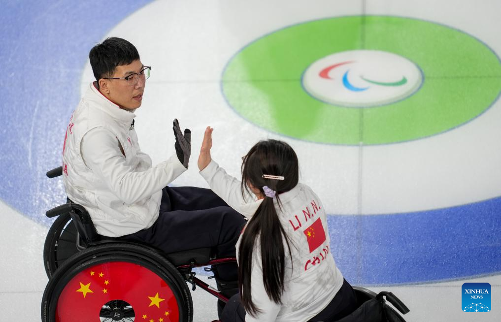 Li Nana (L) of China celebrates with teammate Zhang Mingliang during the wheelchair curling mixed team round robin session 6 match between China and Norway at the Milan-Cortina 2026 Paralympic Winter Games in Cortina D'ampezzo, Italy, March 9, 2026. (Xinhua/Wang Kaiyan)