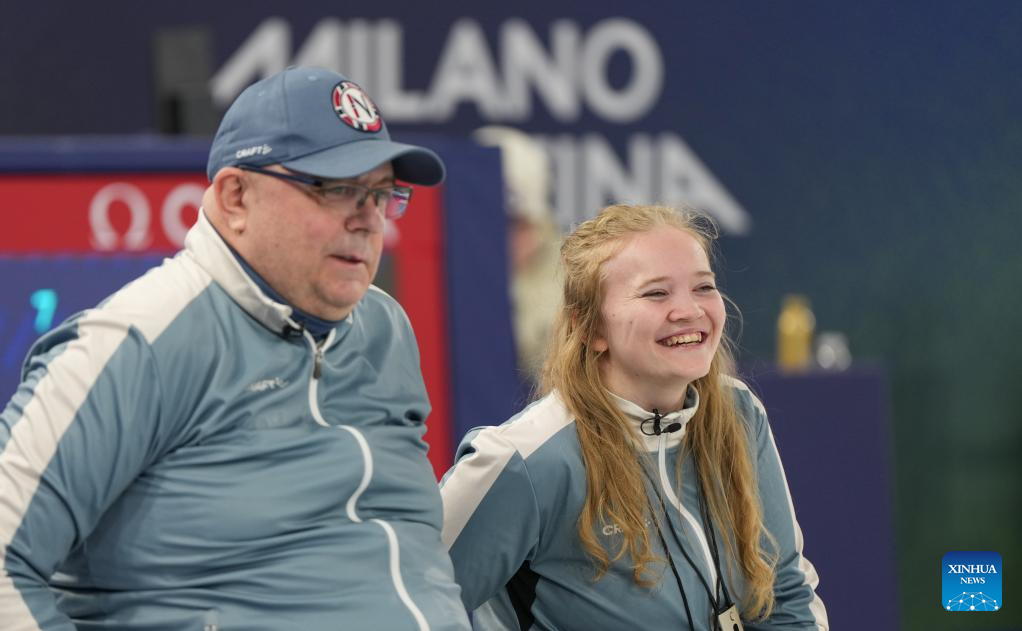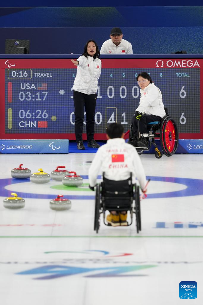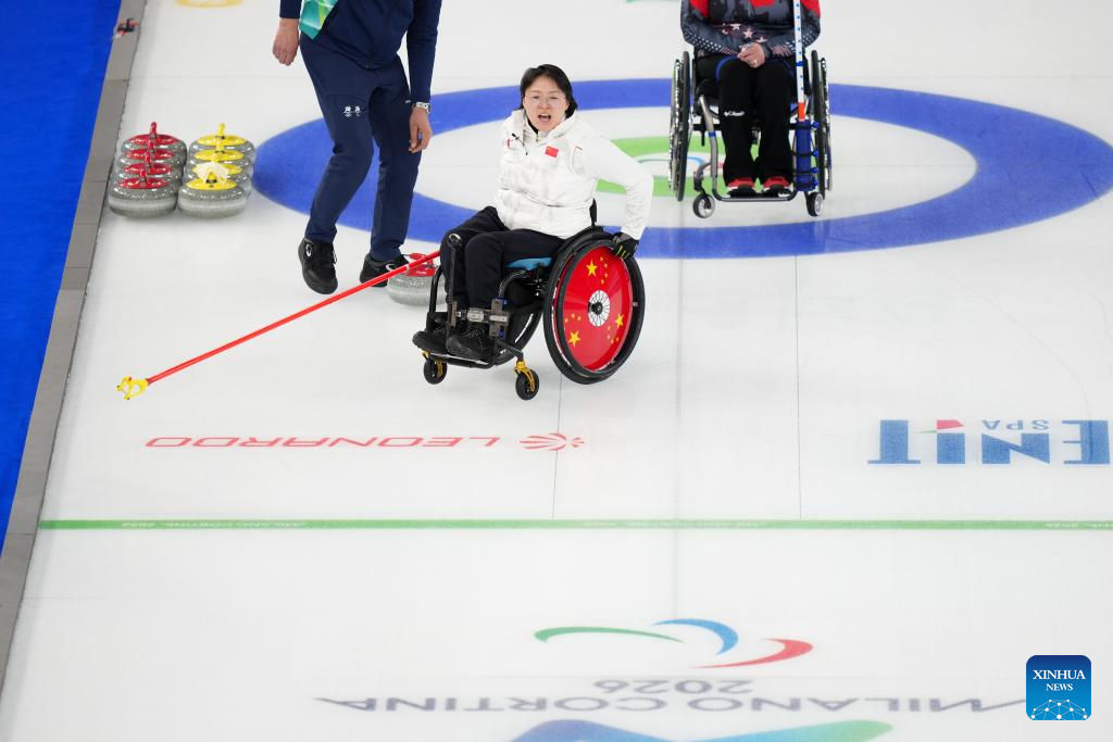 Wang Meng (C) of China reacts during the wheelchair curling mixed doubles round robin session 7 between China and the United States at the Milan-Cortina 2026 Paralympic Winter Games in Cortina D'ampezzo, Italy, March 9, 2026. (Xinhua/Lian Yi)