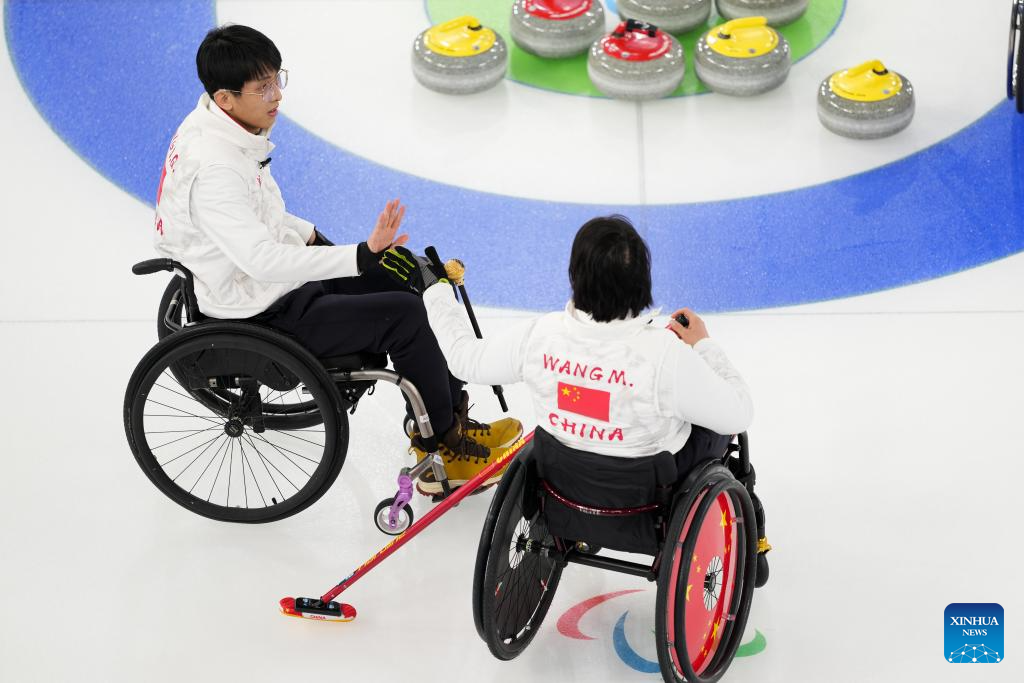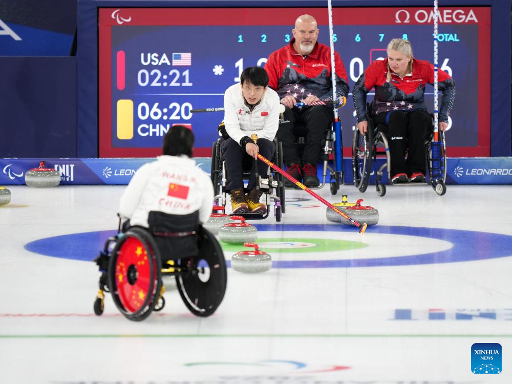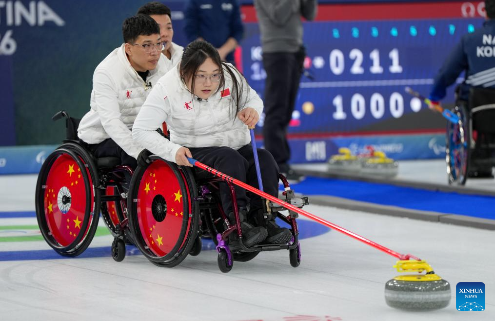 Wang Meng (R) of China competes during the wheelchair curling mixed doubles round robin session 7 between China and the United States at the Milan-Cortina 2026 Paralympic Winter Games in Cortina D'ampezzo, Italy, March 9, 2026. (Xinhua/Lian Yi)
