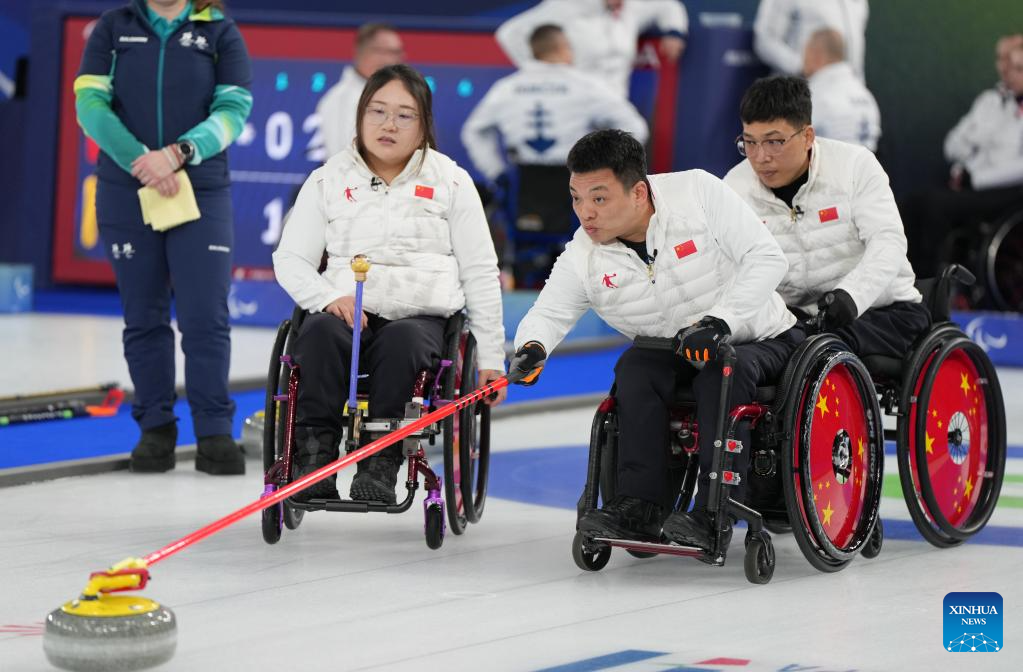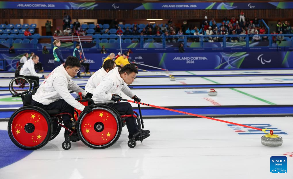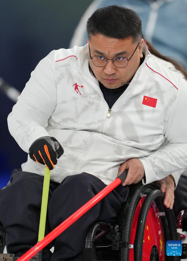 Zhang Mingliang (C) of China competes during the wheelchair curling mixed team round robin session 6 match between China and Norway at the Milan-Cortina 2026 Paralympic Winter Games in Cortina D'ampezzo, Italy, March 9, 2026. (Xinhua/Wang Kaiyan)