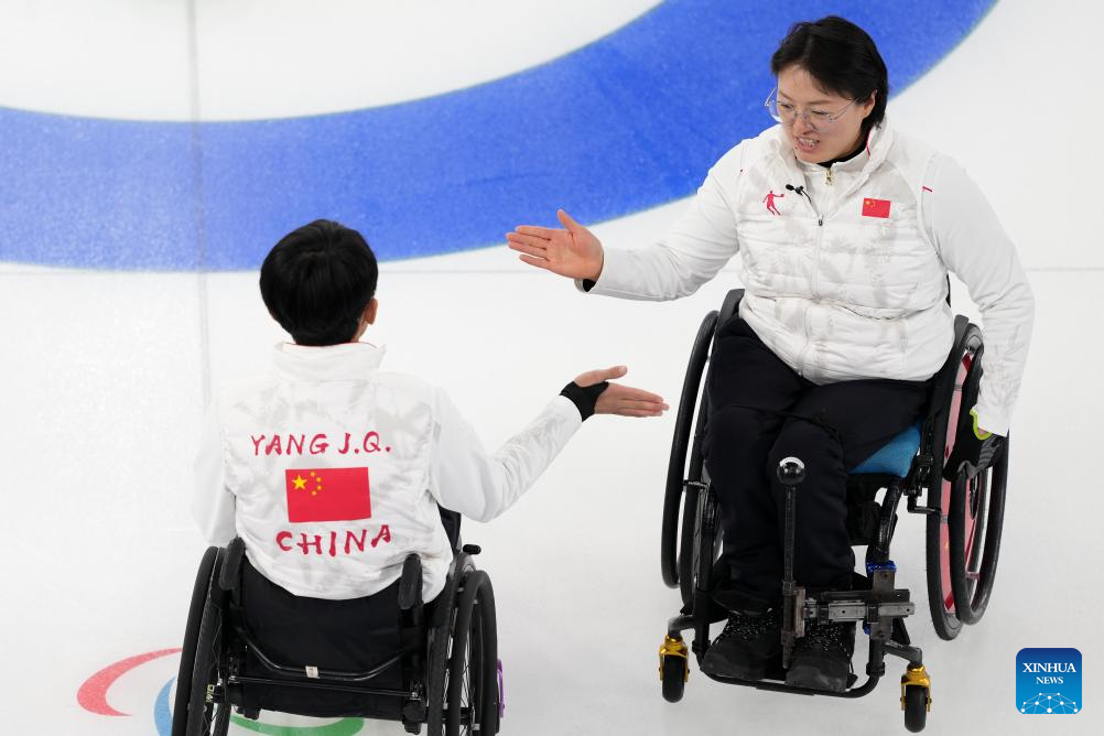 Chen Jianxin (L) of China celebrates with teammate Li Nana during the wheelchair curling mixed team round robin session 6 match between China and Norway at the Milan-Cortina 2026 Paralympic Winter Games in Cortina D'ampezzo, Italy, March 9, 2026. (Xinhua/Wang Kaiyan)