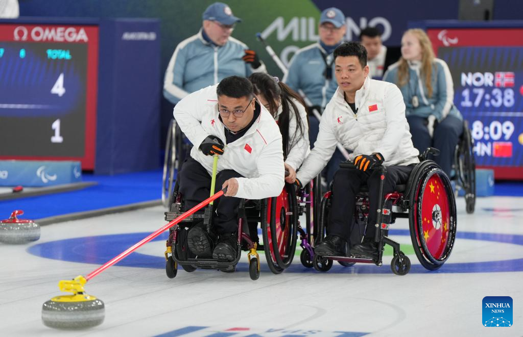 Zhang Mingliang (front R) of China competes during the wheelchair curling mixed team round robin session 6 match between China and Norway at the Milan-Cortina 2026 Paralympic Winter Games in Cortina D'ampezzo, Italy, March 9, 2026. (Xinhua/Wang Kaiyan)