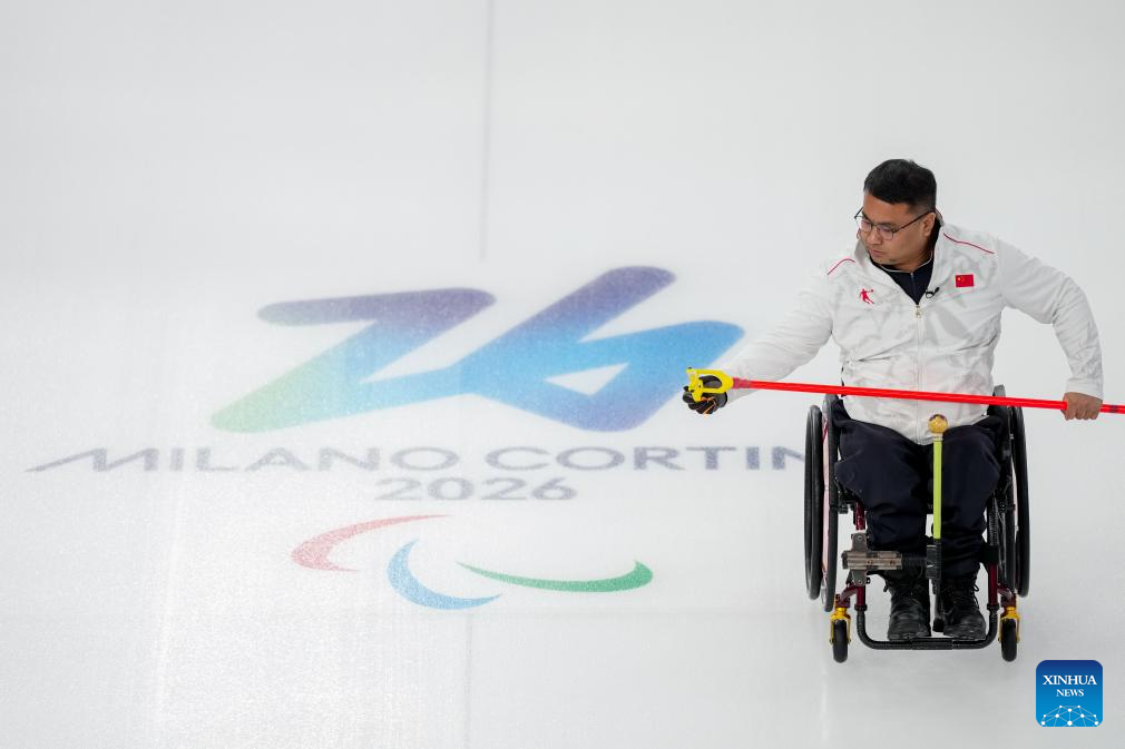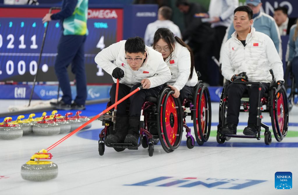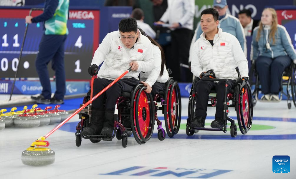 Wang Haitao (front) of China competes during the wheelchair curling mixed team round robin session 6 match between China and Norway at the Milan-Cortina 2026 Paralympic Winter Games in Cortina D'ampezzo, Italy, March 9, 2026. (Xinhua/Wang Kaiyan)