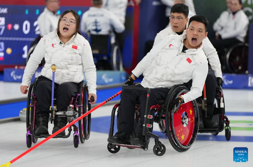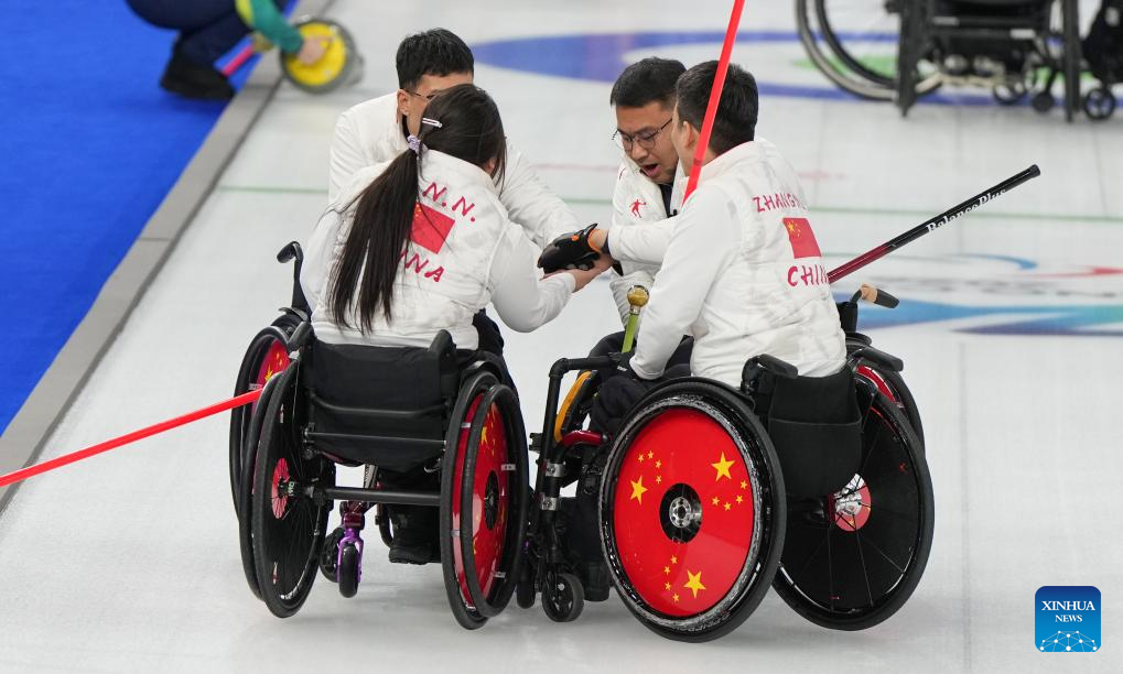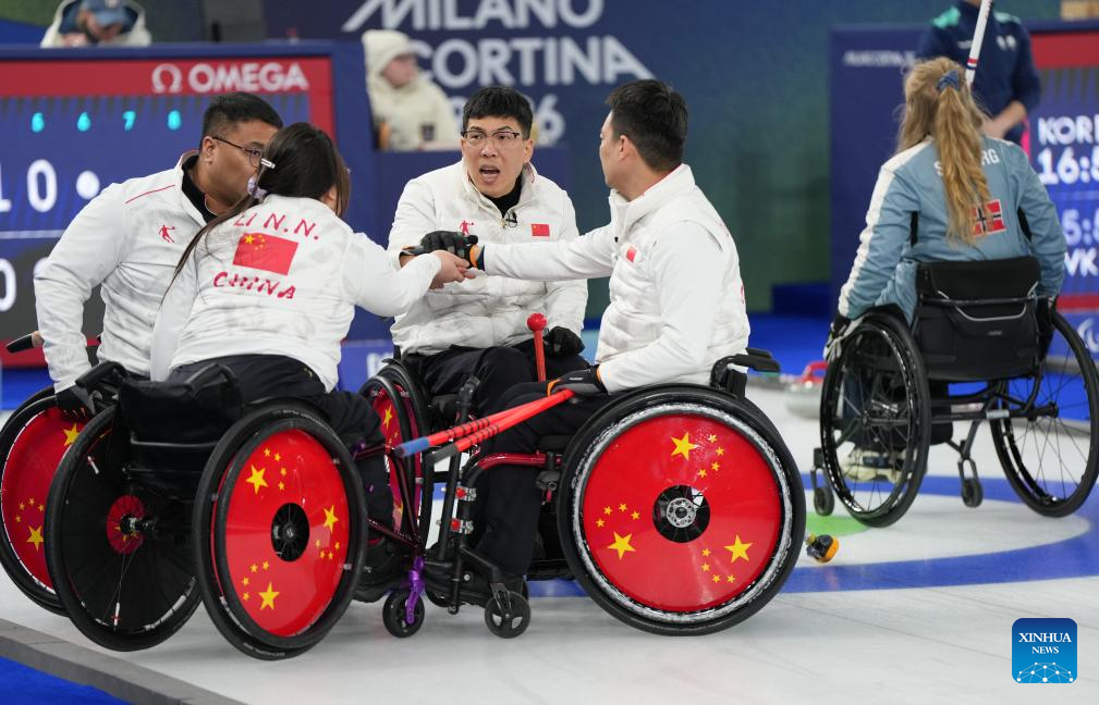 Players of China cheer up during the wheelchair curling mixed team round robin session 6 match between China and Norway at the Milan-Cortina 2026 Paralympic Winter Games in Cortina D'ampezzo, Italy, March 9, 2026. (Xinhua/Wang Kaiyan)