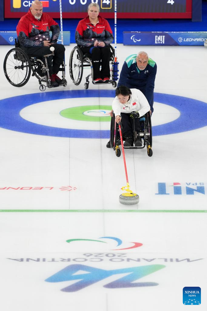 Wang Meng (front) of China competes during the wheelchair curling mixed doubles round robin session 7 between China and the United States at the Milan-Cortina 2026 Paralympic Winter Games in Cortina D'ampezzo, Italy, March 9, 2026. (Xinhua/Lian Yi)