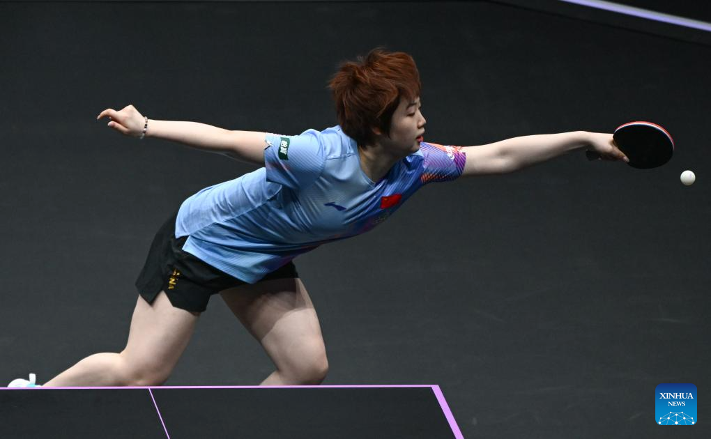 Kuai Man of China hits a return during the women's singles round of 32 match against Elizabeta Samara of Romania at the WTT Champions Chongqing 2026 in southwest China's Chongqing, March 10, 2026. (Xinhua/Chen Cheng)