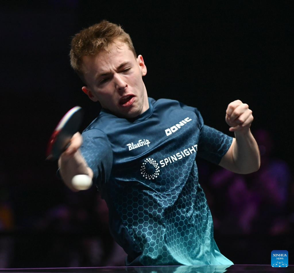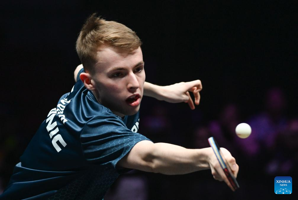 Flavien Coton of France hits a return during the men's singles round of 32 match against Wen Ruibo of China at the WTT Champions Chongqing 2026 in southwest China's Chongqing, March 10, 2026. (Xinhua/Chen Cheng)