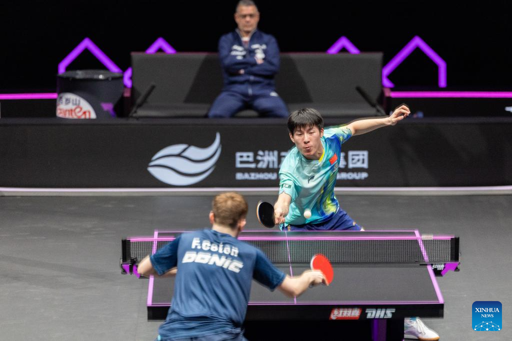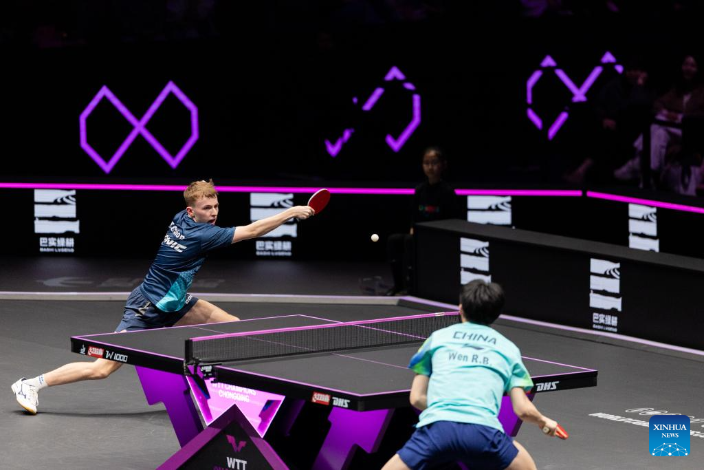 Wen Ruibo (R) of China hits a return during the men's singles round of 32 match against Flavien Coton of France at the WTT Champions Chongqing 2026 in southwest China's Chongqing, March 10, 2026. (Xinhua/Huang Wei)
