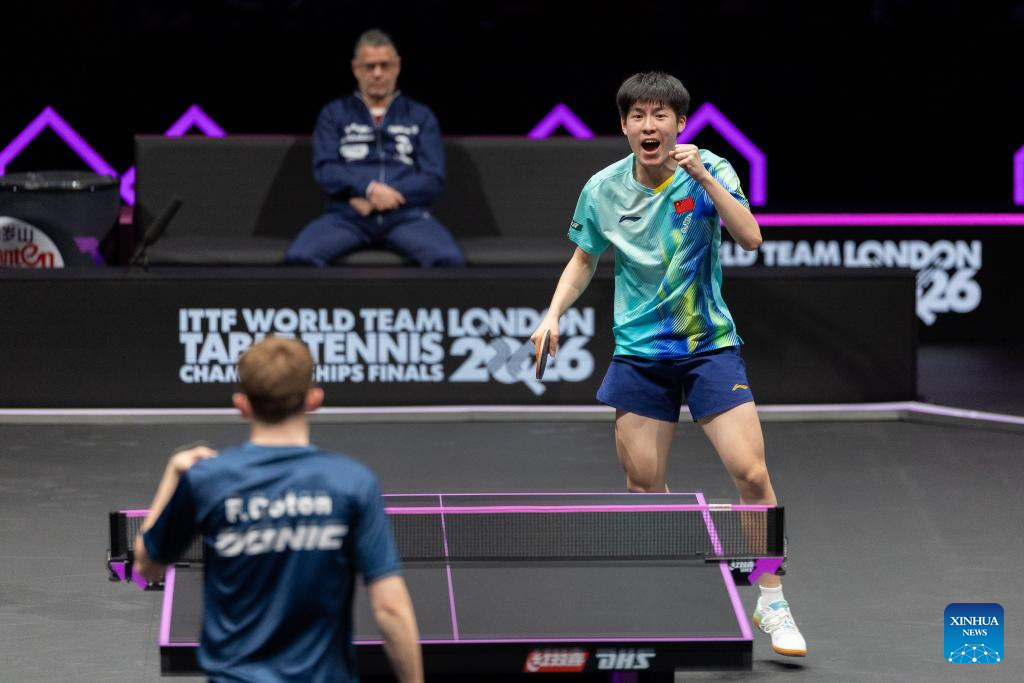 Wen Ruibo (R) of China celebrates a score during the men's singles round of 32 match against Flavien Coton of France at the WTT Champions Chongqing 2026 in southwest China's Chongqing, March 10, 2026. (Xinhua/Huang Wei)