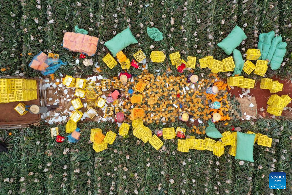 An aerial drone photo taken on March 12, 2026 shows farmers packing pineapples in Dapo Town of Haikou, south China's Hainan Province. (Xinhua/Guo Cheng)
