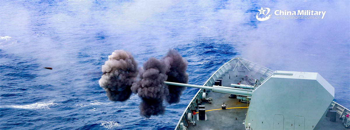 A warship attached to a flotilla of the Chinese PLA Navy fires its main gun during a maritime training exercise in late February, 2026. (eng.chinamil.com.cn/Photo by Wei Chenping)