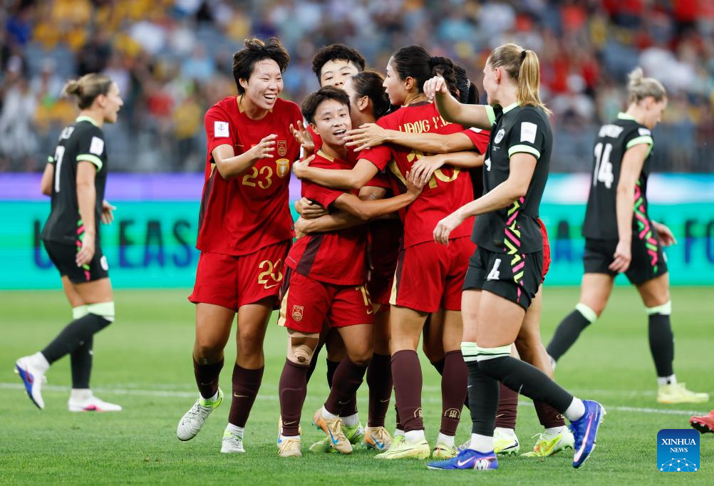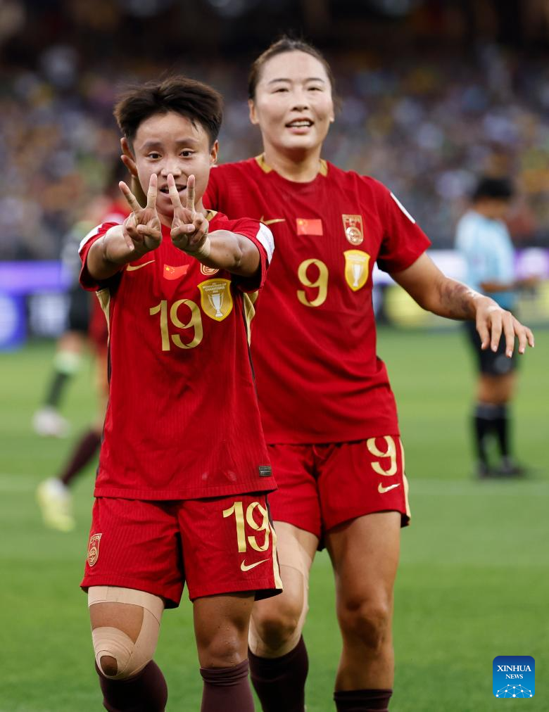 Zhang Linyan (L) of China celebrates after scoring a penalty during the semifinal of Women's Asian Cup between China and Australia at Perth Stadium in Perth, Australia, March 17, 2026. (Xinhua/Ma Ping)