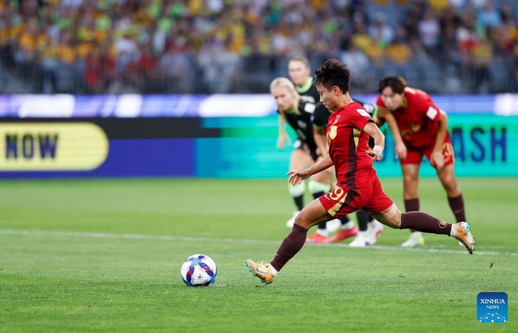 Zhang Linyan of China shoots a penalty during the semifinal of Women's Asian Cup between China and Australia at Perth Stadium in Perth, Australia, March 17, 2026. (Xinhua/Ma Ping)