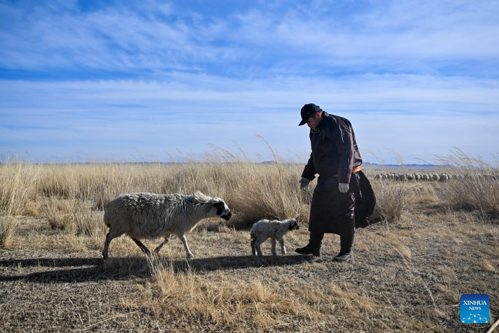 A herdsman herds sheep in East Ujimqin Banner of Xilingol League, north China's Inner Mongolia Autonomous Region, March 17, 2026. Herdsmen on the grasslands of Xilingol League in Inner Mongolia are busy with lamb breeding at present upon the season for lamb births in spring. (Xinhua/Li Zhipeng)