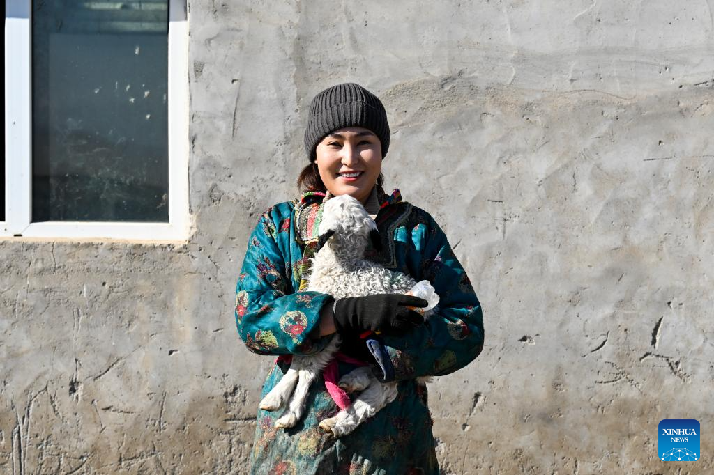 A herdswoman holding a lamb poses for a photo in East Ujimqin Banner of Xilingol League, north China's Inner Mongolia Autonomous Region, March 17, 2026. Herdsmen on the grasslands of Xilingol League in Inner Mongolia are busy with lamb breeding at present upon the season for lamb births in spring. (Xinhua/Li Zhipeng)