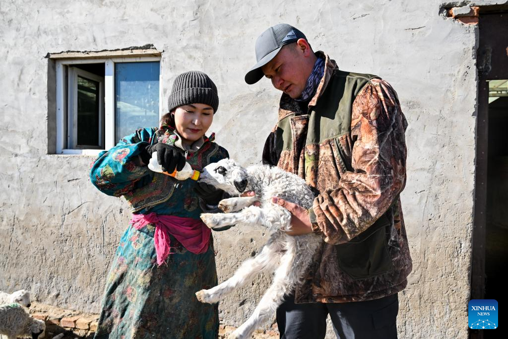 A herdsman (R) and his wife feed milk to a lamb in East Ujimqin Banner of Xilingol League, north China's Inner Mongolia Autonomous Region, March 17, 2026. Herdsmen on the grasslands of Xilingol League in Inner Mongolia are busy with lamb breeding at present upon the season for lamb births in spring. (Xinhua/Li Zhipeng)