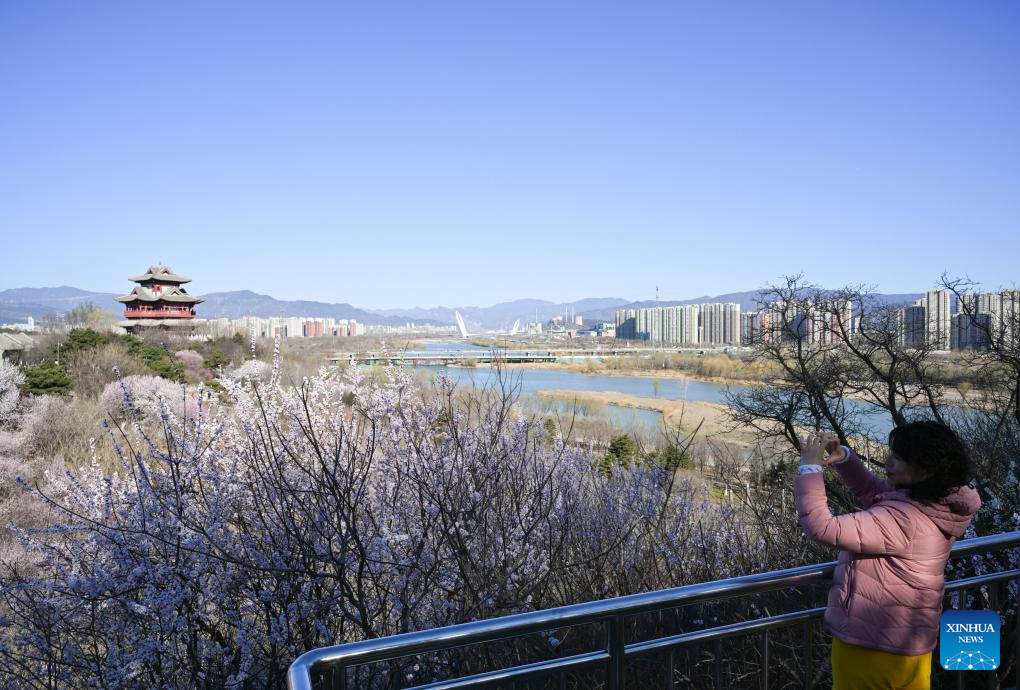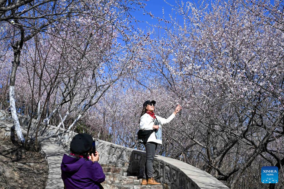 A tourist takes photos of the peach blossoms at the Beijing Garden Expo Park in Beijing, capital of China, March 18, 2026. (Xinhua/Zhang Cheng)