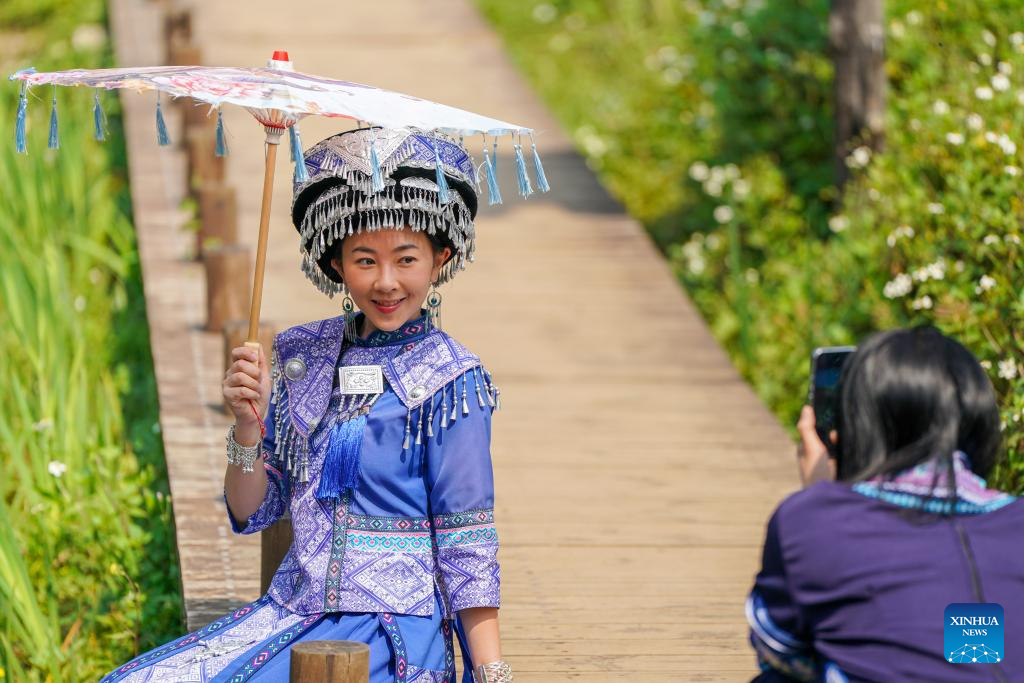 A tourist in ethnic costumes poses for photos at a scenic area in Bamei Village of Guangnan County, Wenshan Zhuang and Miao Autonomous Prefecture, southwest China's Yunnan Province, March 17, 2026. (Xinhua/Peng Yikai)