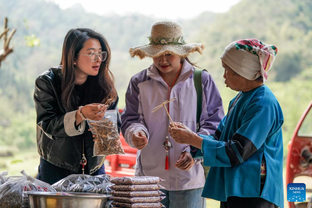 A villager shows local specialties and handicrafts to tourists at a scenic area in Bamei Village of Guangnan County, Wenshan Zhuang and Miao Autonomous Prefecture, southwest China's Yunnan Province, March 17, 2026. (Xinhua/Peng Yikai)