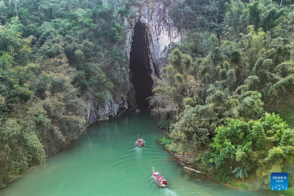Tourists enter a cave by boat at a scenic area in Bamei Village of Guangnan County, Wenshan Zhuang and Miao Autonomous Prefecture, southwest China's Yunnan Province, March 17, 2026. (Xinhua/Peng Yikai)
