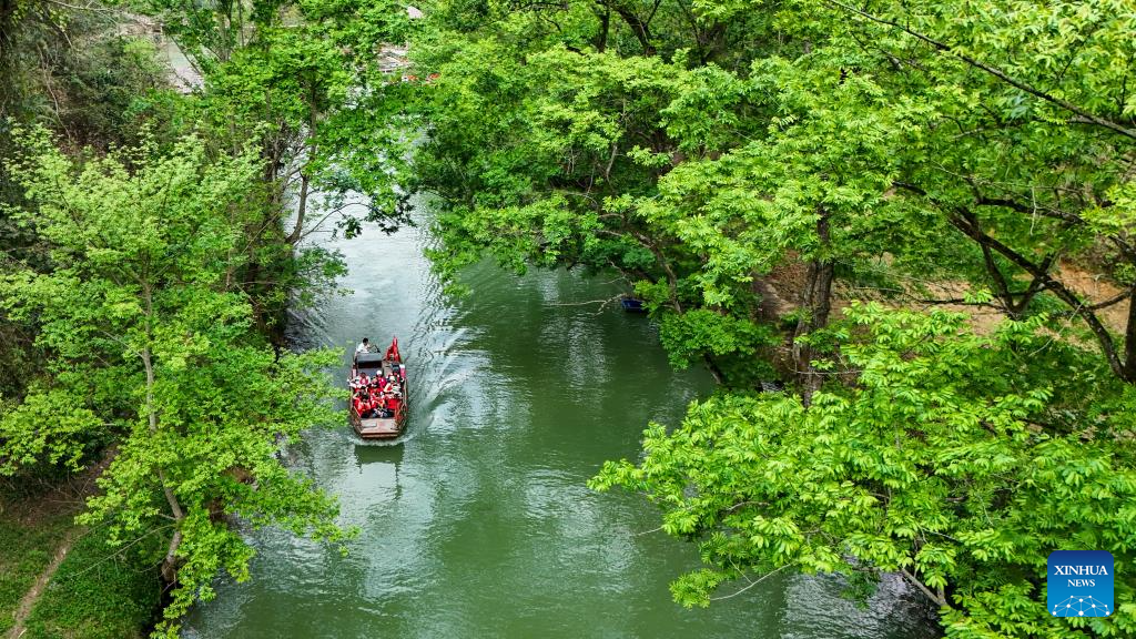 A drone photo taken on March 17, 2026 shows tourists taking a boat tour at a scenic area in Bamei Village of Guangnan County, Wenshan Zhuang and Miao Autonomous Prefecture, southwest China's Yunnan Province. (Xinhua/Peng Yikai)