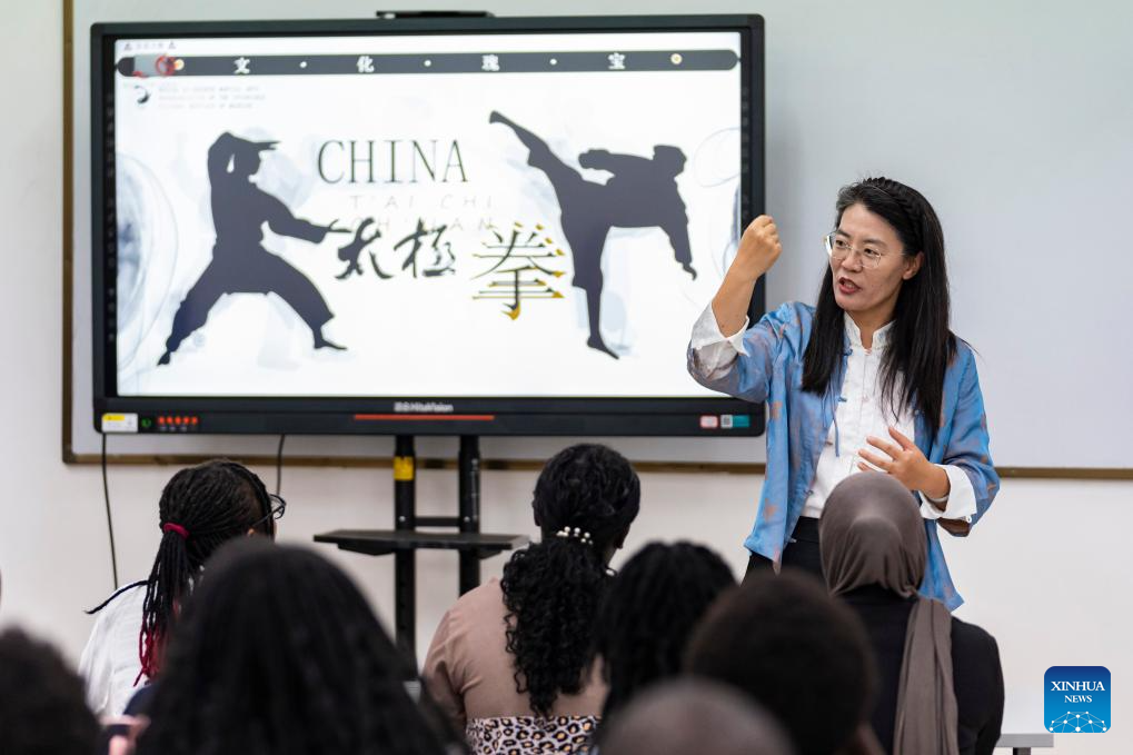 A teacher teaches students about Taijiquan, a kind of Chinese traditional martial arts, at the Confucius Institute at the University of Nairobi, in Nairobi, Kenya, March 18, 2026. Upon the upcoming first International Taijiquan Day, the Confucius Institute at the University of Nairobi promoted Chinese traditional culture and fostered China-Kenya cultural exchange by teaching the history and cultural background of Taijiquan and organizing students to learn and practice the martial arts.