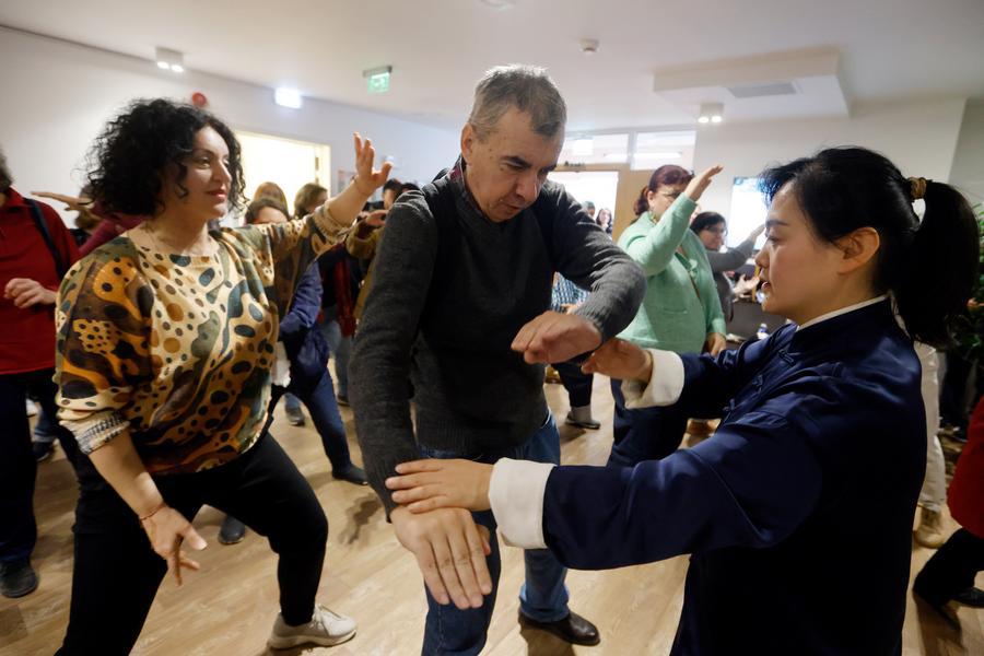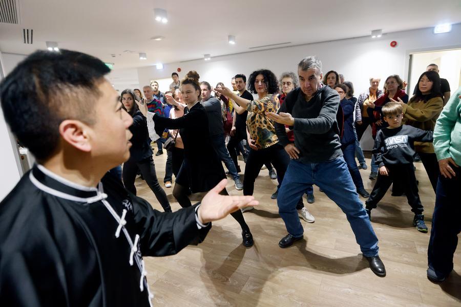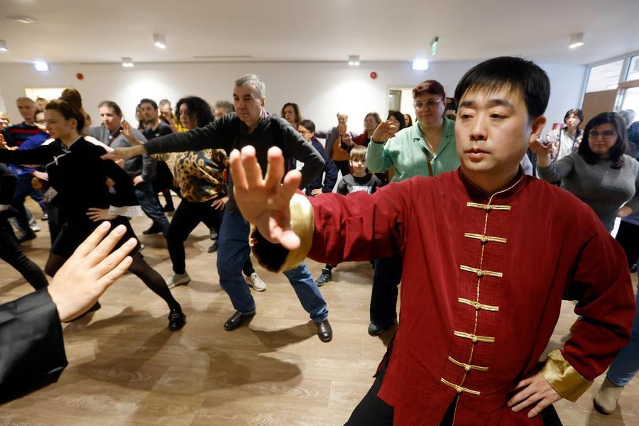 Romanians practice Taijiquan, a kind of Chinese traditional martial arts, with a Chinese master during an International Taijiquan Day event at the Chinese Cultural Center in Bucharest, Romania, March 20, 2026. A lecture ahead of the first International Taijiquan Day was held on Friday at the Chinese Cultural Center in Bucharest. (Photo by Cristian Cristel/Xinhua)
