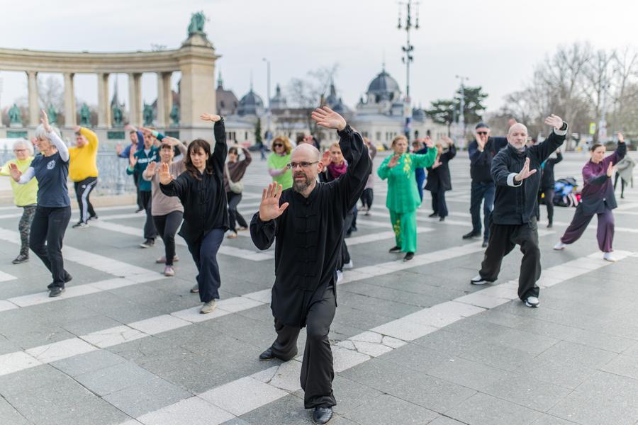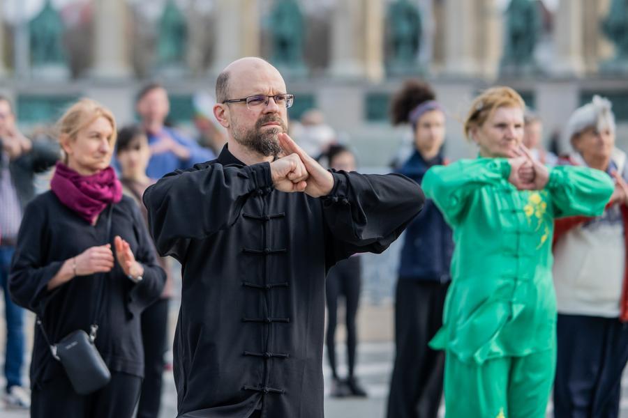 Taijiquan enthusiasts perform during the celebration event in Budapest, Hungary, on March 21, 2026. A celebration of the first International Day of Taijiquan, organized by the Hungarian Wushu Federation, was held here on Saturday at Heroes' Square. (Photo by Marton Koncz/Xinhua)